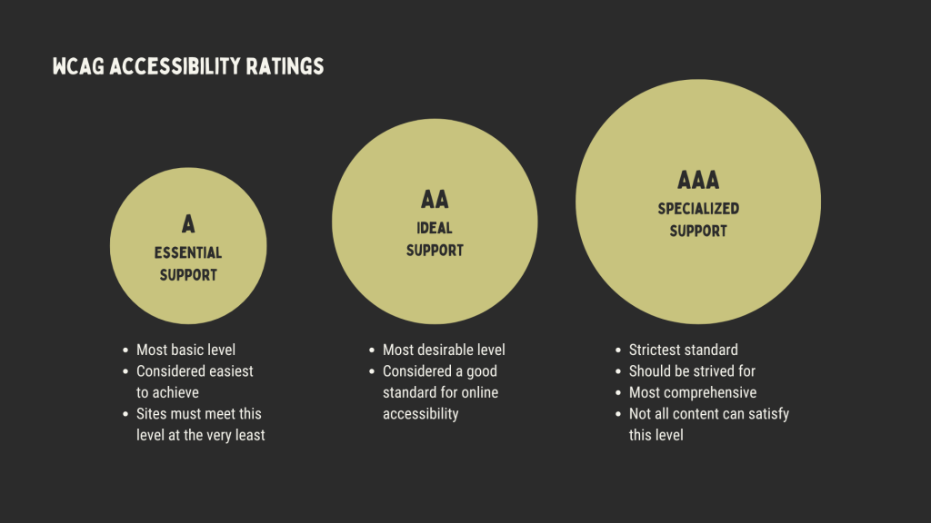 Accommodating everyone’s needs sounds like a hefty task, but by keeping the design process user-centric throughout will help to identify user needs in order to design based around user behaviour. When websites are built to the strictest accessibility standards, they are not only user-friendly for all, but the standards will also ensure that the design meets at least the basic legal requirements—therefore addressing and avoiding any legal concerns and negative KPI results. Accessibility guidelines involve three levels, which categorise accessibility conformance into different tiers: